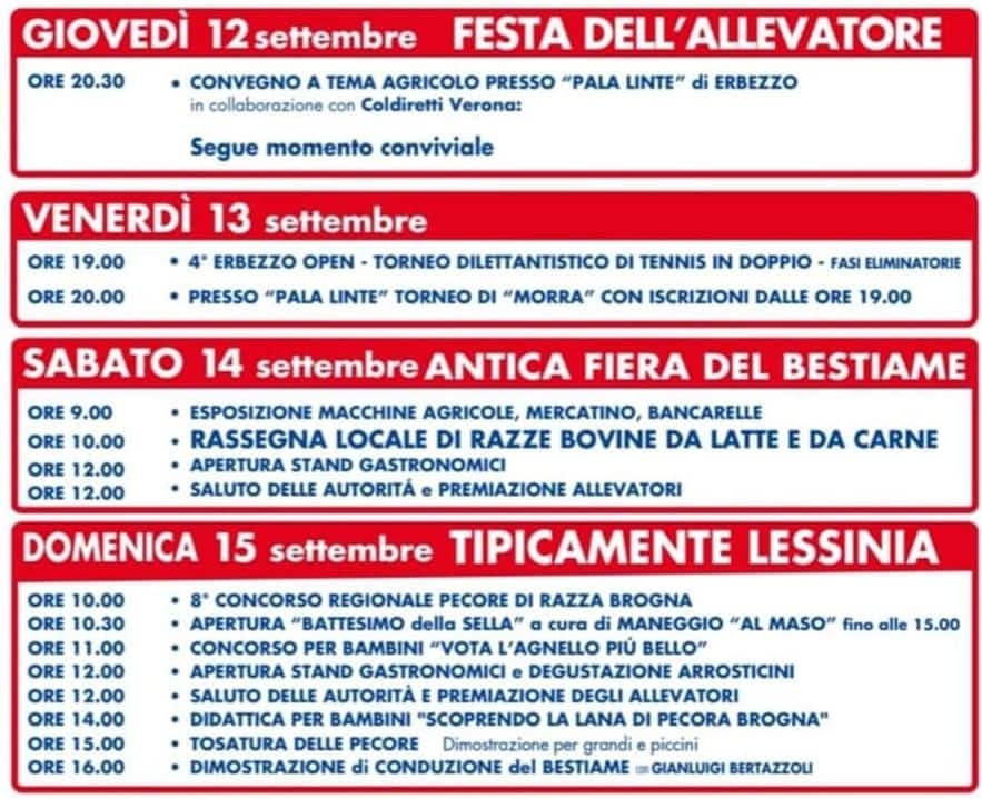 Risalente al lontano 1886, l’Antica Fiera del Bestiame di Erbezzo è con ogni probabilità la più antica fiera della Lessinia: quest’anno si tiene dall’11 settembre al 14 settembre 2025.