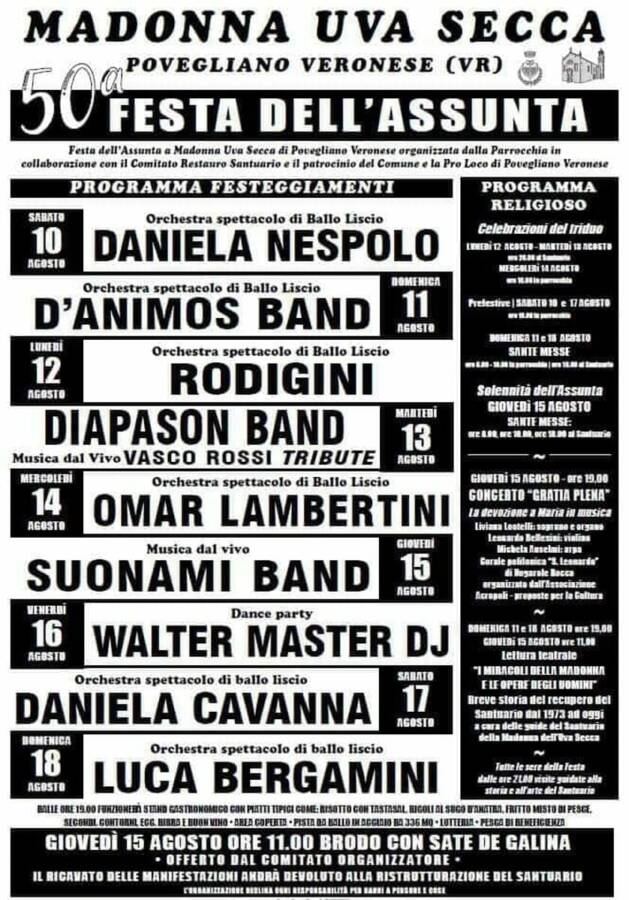 Ritorna dal 10 al 18 Agosto la 50esima edizione della Festa dell’Assunta a Madonna Uva Secca di Povegliano Veronese organizzata dalla Parrocchia in collaborazione con il comitato Restauro Santuario e il patrocinio del Comune e la Pro Loco di Povegliano Veronese.