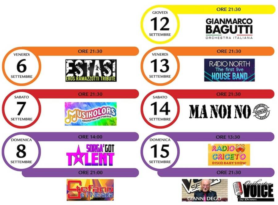 Stand gastronomici aperti tutte le sere dalle 19:30 e le domeniche anche a mezzogiorno.