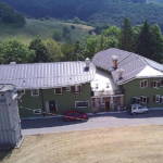 Pasta casareccia e carne cotta nel camino in un ambiente rustico con sedie impagliate e terrazza sul tetto.