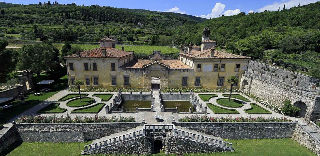 L’artefice del progetto non è sicuro: alcuni la attribuiscono a Michele Sanmicheli, altri a Giulio Romano, altri ancora a Bartolomeo Ridolfi. Persino il periodo della costruzione è incerto: è stato ritrovato solo un disegno del 1562. Si tratta di tre bellissimi cortili digradanti che portano al brolo e all’ampio giardino, uniti in uno stretto rapporto tra architettura e natura.