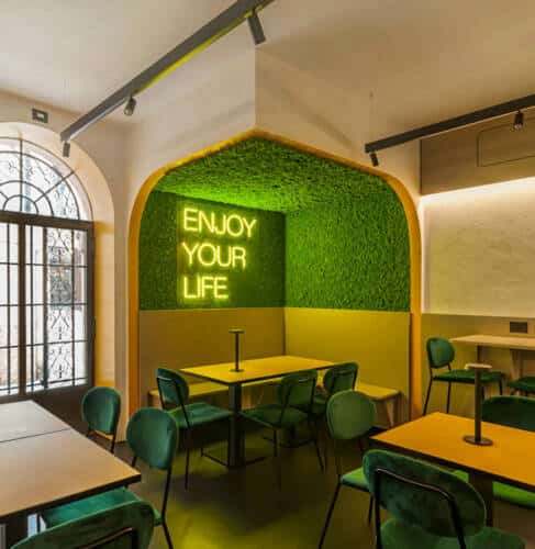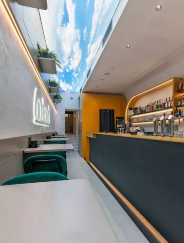 Uno degli aspetti più unici e affascinanti del Boulevard è il suo design spettacolare, con un tocco davvero unico nel suo genere. Già dall’ingresso, gli ospiti sono accolti da un cielo rappresentato sul soffitto, una novità assoluta che incanta e stupisce, contribuendo a creare un ambiente magico e inimitabile. Ogni sala del locale ha la sua particolarità, dalla vivacità del bancone principale all’entrata, alla tranquillità di un giardino verticale nella sala più riservata, offrendo spazi adatti a ogni desiderio e necessità.
