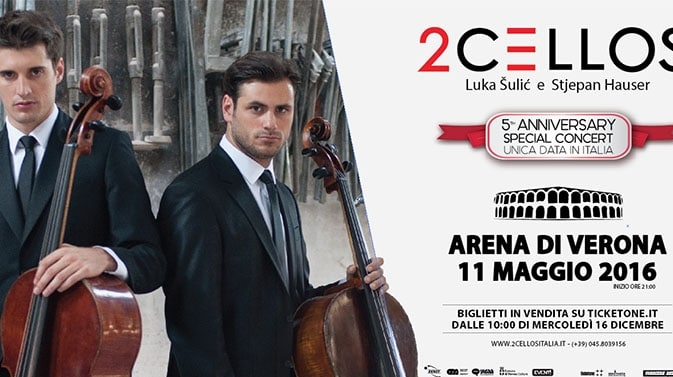 Inarrestabili 2Cellos! Mentre continuano ad inanellare concerti sold out in arene e teatri di tutto il mondo, le due rockstar del violoncello Luka Šulia e Stjepan Hauser annunciano un concerto-evento per celebrare i primi 5 anni del loro progetto artistico: un 5th Anniversary Special Concert che si terra all Arena di Verona l 11 maggio 2016 e sarà non solo la loro unica data in Italia, ma anche la prima del tour europeo 2016.