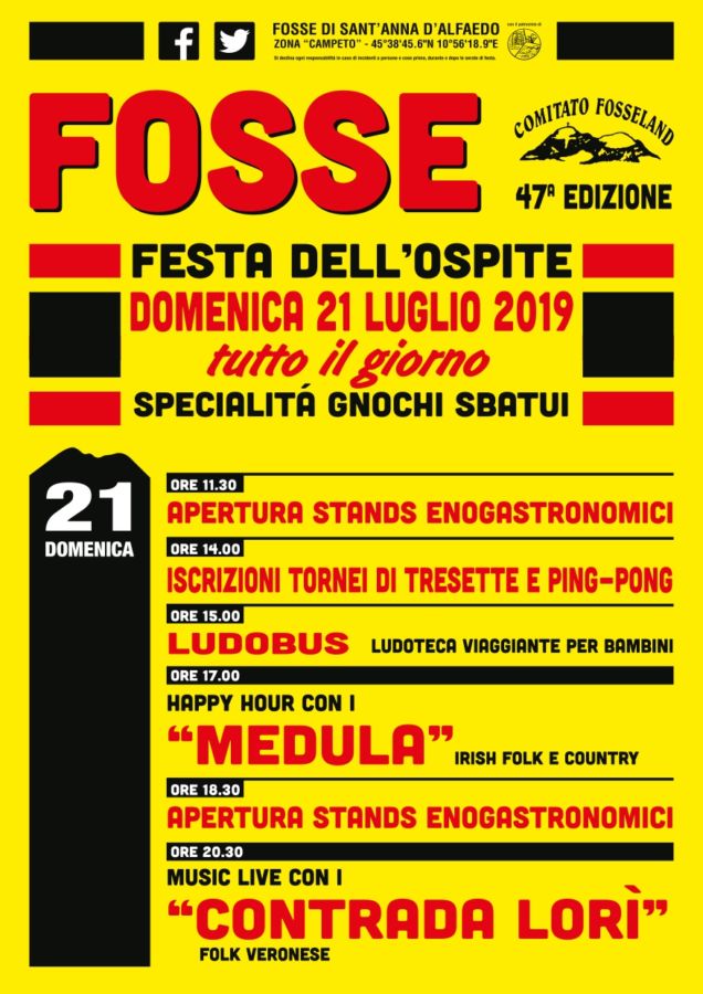 La 47a edizione della Festa dell’Ospite di Fosse si terrà domenica 21 Luglio 2019. La specialità gastronomica dell’evento saranno i “gnochi sbatui”.