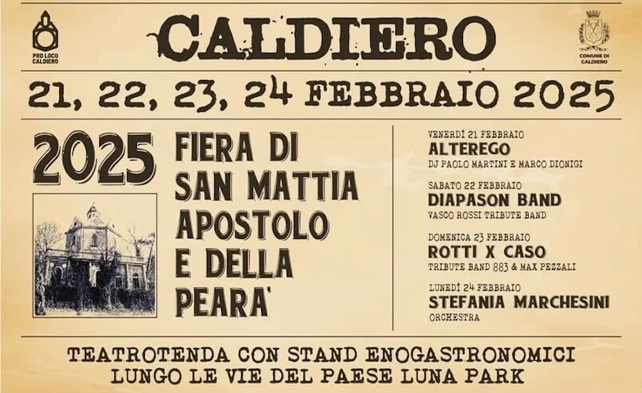 La Fiera di San Mattia, nata nel 1870 per onorare il Santo Patrono, San Mattia Apostolo, è una celebrazione della tradizione e dello stare insieme. Questo evento rappresenta il cuore pulsante della comunità di Caldiero, un’occasione unica per ritrovarsi sotto il tendone, assaporare una cena tipica e trascorrere momenti piacevoli in compagnia. I profumi delle specialità preparate per l’occasione evocano nei cittadini ricordi preziosi e il calore delle antiche usanze.