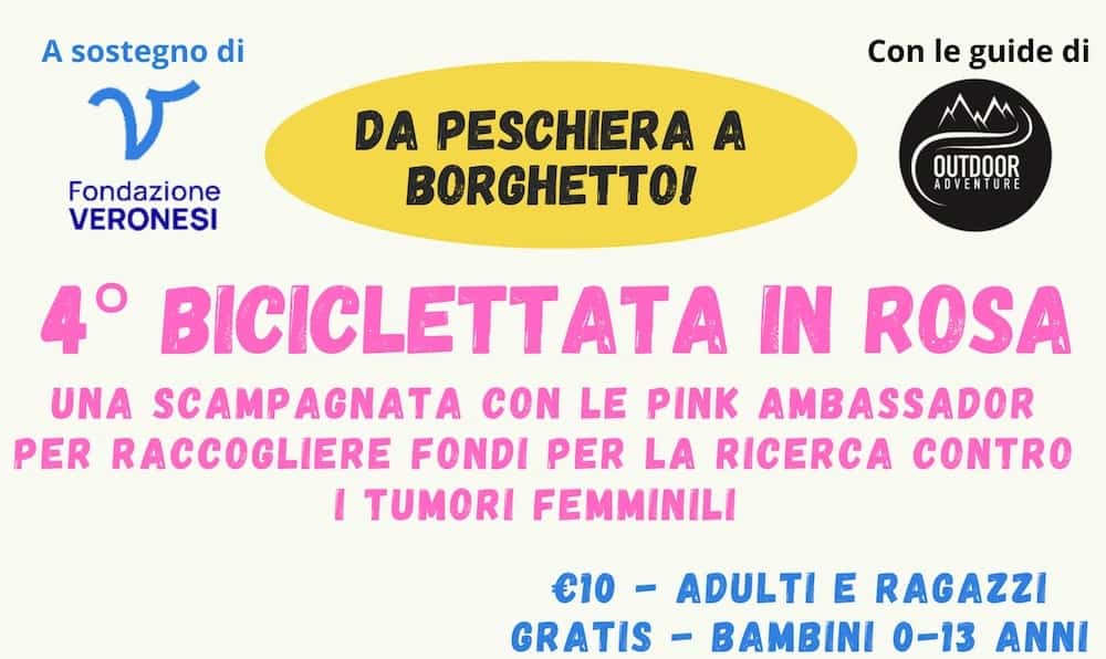 Torna per il 4° anno la Biciclettata in Rosa con le Pink Ambassador di Verona a sostegno della ricerca scientifica sui tumori femminili. Quest’anno si svolgerà sulla ciclabile del Mincio da Peschiera del Garda fino a Borghetto sul Mincio, uno dei borghi più belli d’Italia. Ci si fermerà per una visita a Borghetto, per poi ritornare verso Peschiera. Il percorso è facile e adatto a tutti!