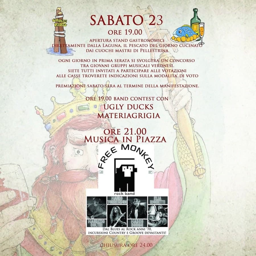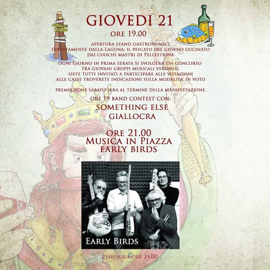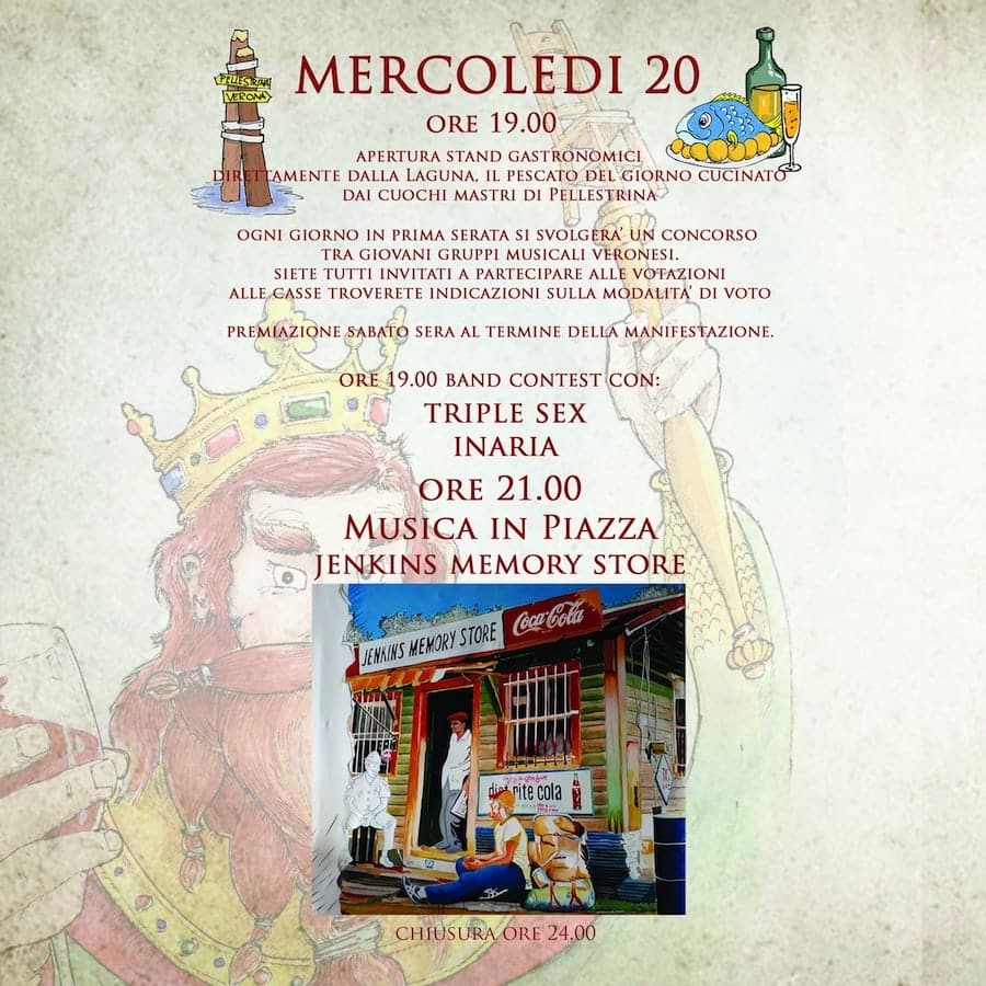 Ricco e da non perdere il programma musicale, dove ogni giorno in prima serata dalle 19.00, si svolgerà un concorso tra giovani gruppi musicali veronesi. Siete tutti invitati a partecipare alle votazioni (alle casse troverete indicazioni sulla modalità di voto). Direttamente dalla laguna, Il Pescato del giorno cucinato dai cuochi Mastri di Pellestrina.