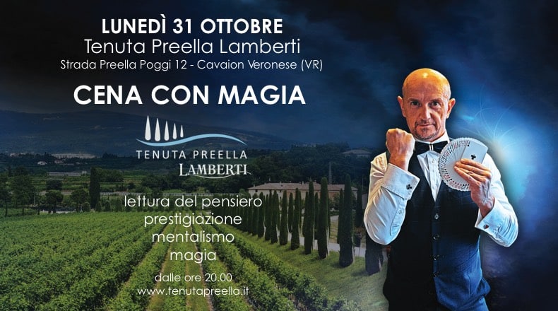 Lunedì 31 ottobre alle 20.00 un atmosfera di fascino e magia avvolgera la Tenuta Preella Lamberti. Le sale saranno la location ideale per la “Cena con Magia“: una serata piena di mistero in cui resterete “incantati” a tutti gli effetti.