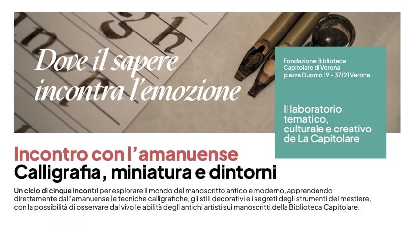Alla Biblioteca Capitolare di Verona torna il ciclo di incontri con l’Amanuense, rivolto a tutti coloro che desiderano approfondire la conoscenza delle tecniche di scrittura antiche in un’atmosfera ricca di storia e sapere. La rassegna si snoda quest’anno in cinque laboratori, in programma da febbraio a novembre, per esplorare da vicino i segreti della scrittura, della miniatura e degli stili decorativi e cimentarsi in questa arte con l’ausilio di specialisti di alto profilo.