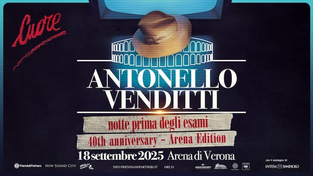 Giovedì 18 settembre 2025 alle ore 21.00 Antonello Venditti torna all’Arena di Verona, dove il cantautore romano farà tappa col nuovo tour “Notte prima degli esami 40th anniversary – 2025 Edition”.