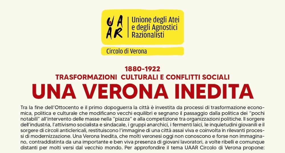 UAAR, col patrocinio del Comune di Verona, propone alla cittadinanza un approfondimento sul periodo di storia veronese che va dal 1880 al 1922.