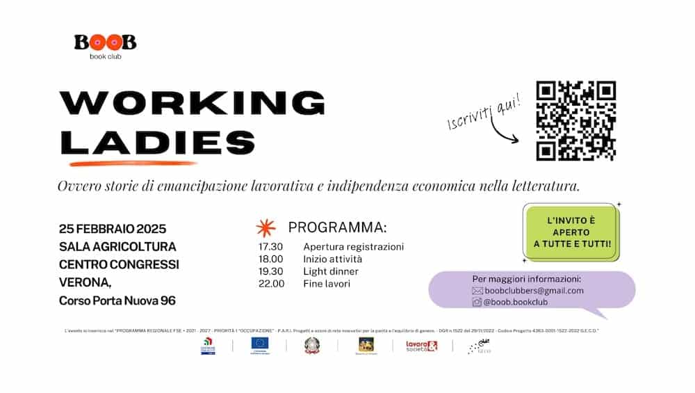 L’evento, gratuito e su prenotazione attraverso il QRcode o a questo link urly.it/314pwj, è organizzato in collaborazione con Lavoro & Società, grazie al PROGRAMMA REGIONALE FSE+ 2021-2027 – PRIORITÀ 1 “OCCUPAZIONE” – P.A.R.I. Progetti e azioni di rete innovativi per la parità e l’equilibrio di genere – DGR n.1522 del 29/11/2022 – Codice Progetto 4363-0001-1522-2022 G.E.C.O.