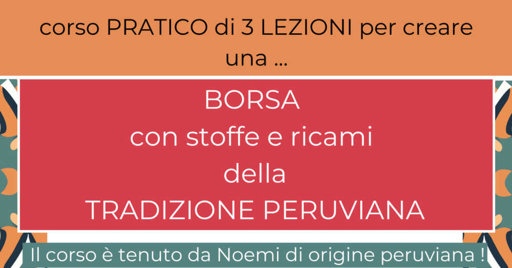 Lunedì 30 ottobre 2023, dalle ore 19:00 alle ore 21:00 si terrà la prima lezione del nuovo Corso per Creare Borse Peruviane. Il corso consisterà in tre lezioni per apprendere la magnifica arte del cucito e del ricamo peruviano in compagnia di Noemi, artigiana di origine peruviana che metterà a disposizione le stoffe con cui ogni partecipante potrà creare la propria originale borsa.