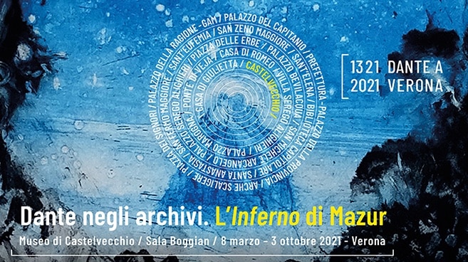 L’esposizione in Sala Boggian Dante negli archivi. L’Inferno di Mazur, insieme alla Mappa dei luoghi danteschi e alla mostra Tra Dante e Shakespeare. Il mito di Verona prevista alla Galleria d’Arte Moderna Achille Forti per il 7 maggio 2021, costituiscono gli appuntamenti della mostra diffusa Dante a Verona 1321-2021, realizzata dal Comune di Verona nell’ambito del progetto Verona, Dante e la sua eredità 1321-2021 promosso dal Protocollo d’Intesa interistituzionale, con il patrocinio del Comitato nazionale per la celebrazione dei 700 anni dalla morte di Dante Alighieri, con il contributo di Fondazione Banca Popolare di Verona e di Zalando.
