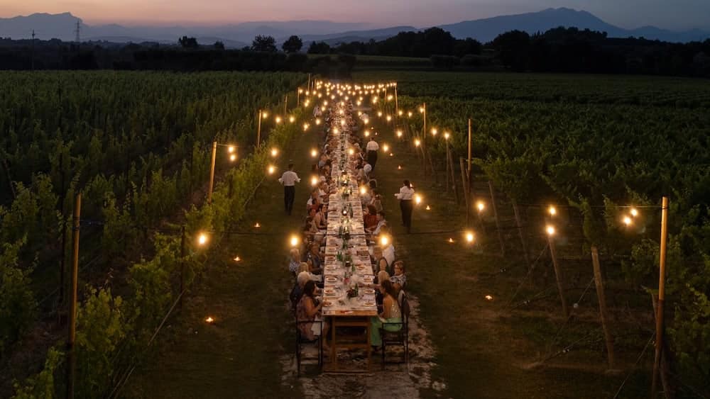 Una cena sotto le stelle, l’atmosfera magica della vigna al tramonto e il piacere di condividere una serata fuori dal tempo in puro stile italiano.
