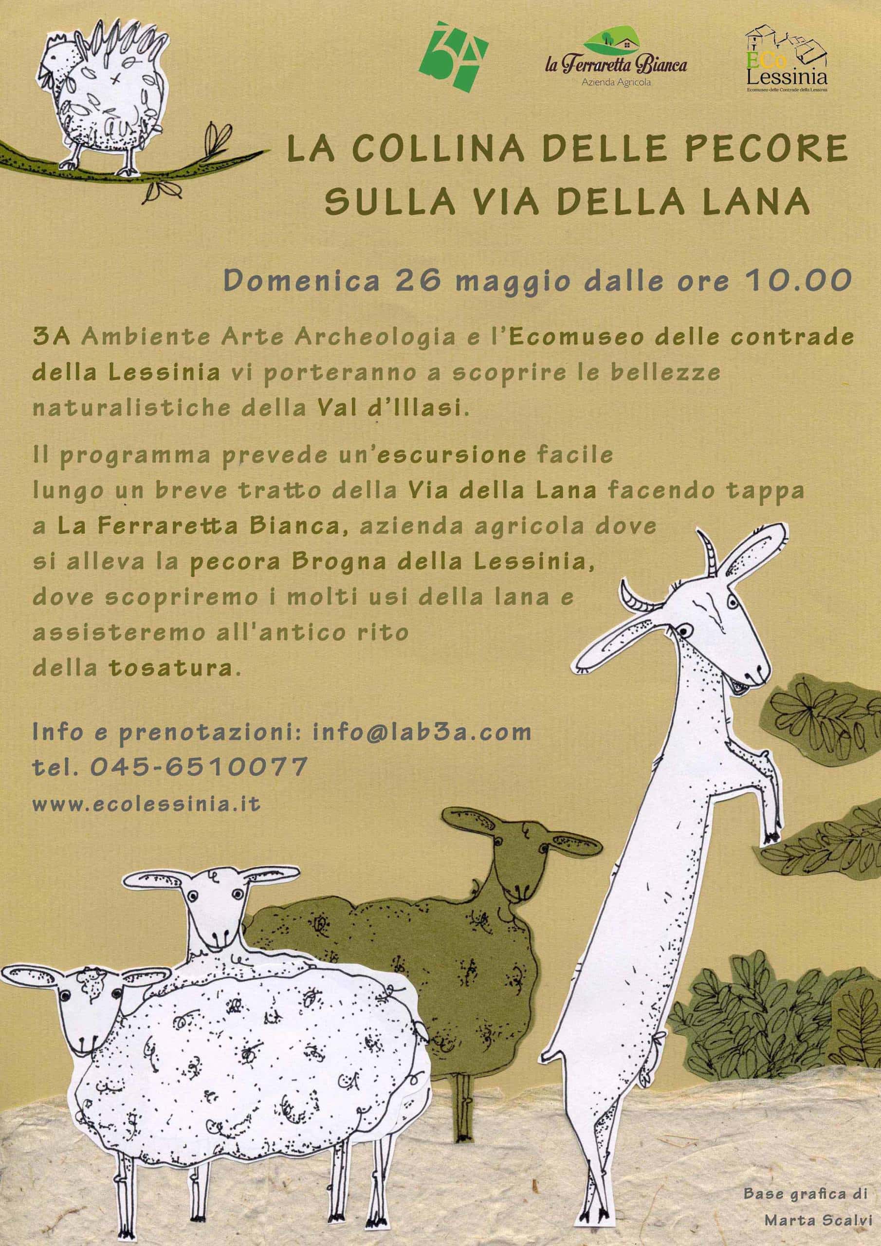 Escursione guidata con EcLessinia e 3A Ambiente Arte Archeologia lungo un tratto della Via della Lana sulle colline di Tregnago; si farà tappa a “La Ferraretta Bianca”, dove si alleva la pecora Brogna della Lessinia e dove si assisterà alla tosatura delle pecore. Picnic sui prati dell’azienda agricola.