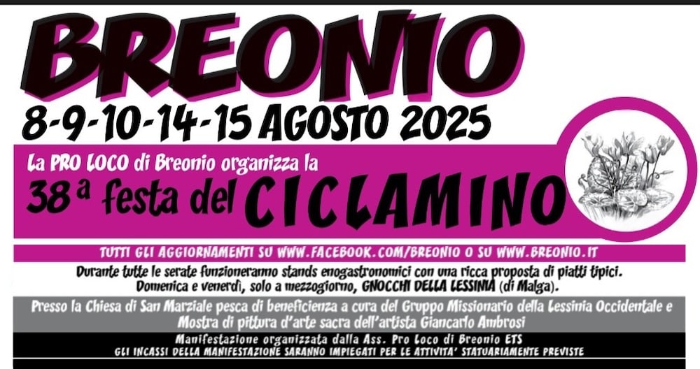 L’8, 9, 10, 14 e 15 Agosto 2025 la Pro Loco di Breonio organizza la 38ª Festa del Ciclamino. Durante tutte le serate funzioneranno stands enogastronomici con una ricca proposta di piatti tipici.