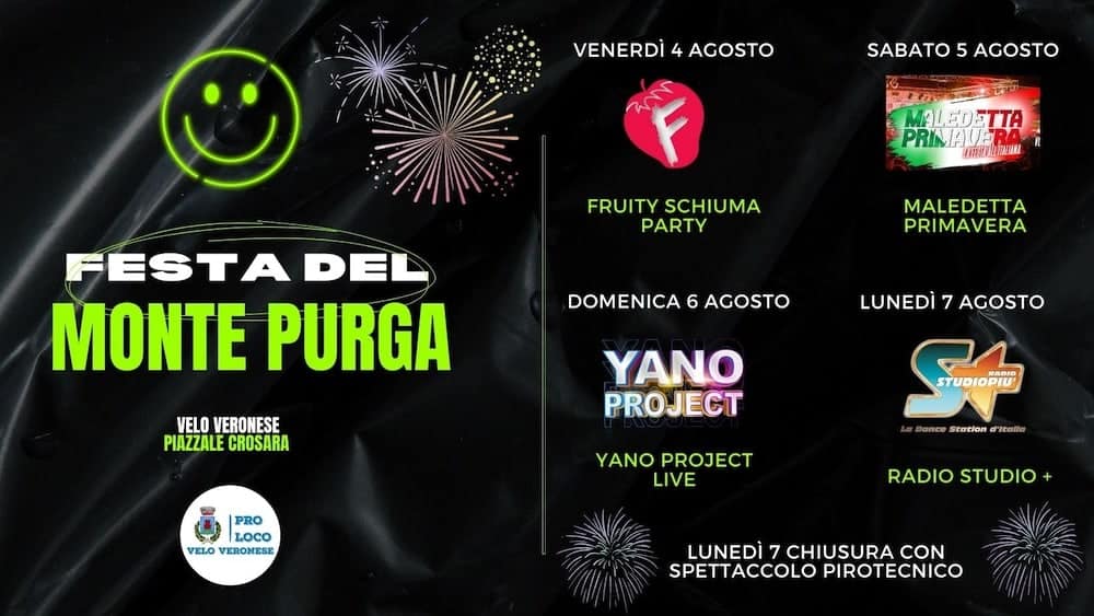 Come ogni anno, nel cuore della Lessinia, i ragazzi della Pro Loco di Velo Veronese presentano la tradizionale Festa del Monte Purga dal 1° al 3 Agosto nella Piazza della Vittoria di Velo Veronese.
