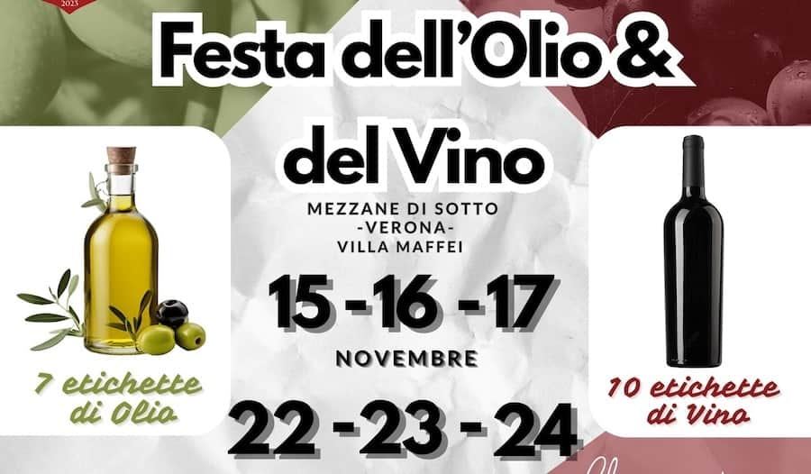 Dal 21 al 23 Novembre e dal 29 al 30 Novembre a Mezzane di Sotto si terrà la 29esima edizione della Festa dell’Olio e del Vino. La Festa dell’olio e del vino racchiude gusti e sapori dei nostri produttori di olio e di vino della vallata di Mezzane.