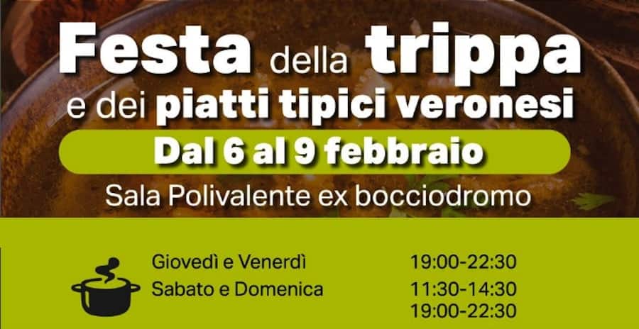 La nuova edizione della Festa della Trippa e dei piatti tipici veronesi si terrà dal 6 al 9 febbraio 2025 presso la sala polivalente dell’ex bocciodromo in Strada San Vittore. Una festa che è motivo di orgoglio nel richiamare la tradizione culinaria del territorio dove si potranno gustare alcuni tra i piatti tipici più amati e conosciuti del territorio, come la trippa, il risotto col Tastasal, la polenta e la pastisada de caval, accompagnata da quattro serate di intrattenimento musicale.