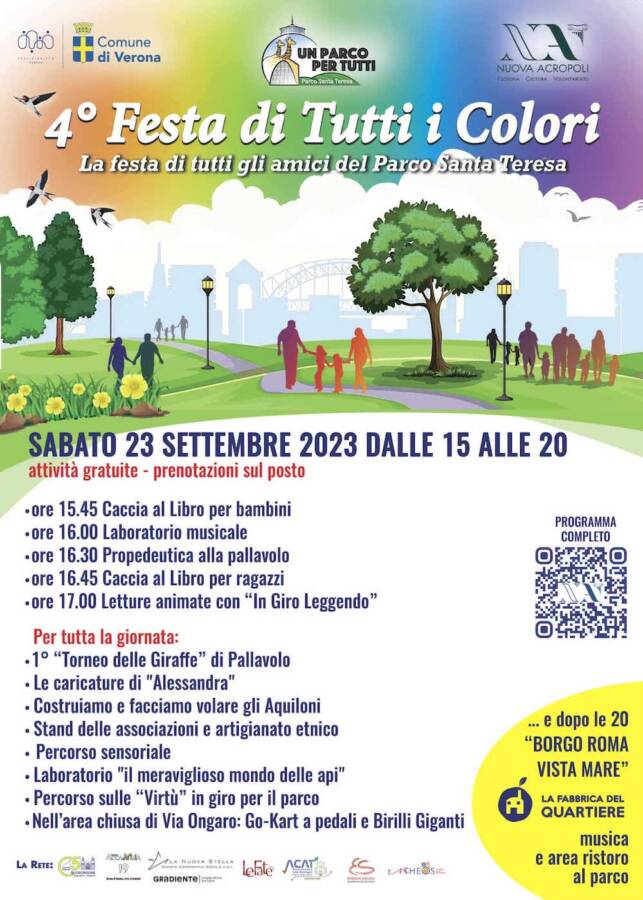 L’evento, che rientra nel Patto di Sussidiarietà stipulato nel 2019 con il Comune di Verona e che è arrivato alla sua quarta edizione, è in programma sabato 23 settembre dalle 15:00 alle 24:00 al Parco Santa Teresa in Via Ongaro. Obiettivo della festa è quello di valorizzare le diverse etnie che quotidianamente vivono il parco cittadino ed infatti le attività proposte non solo esprimono la grande ricchezza culturale della zona, ma sono adatte ad ogni età.