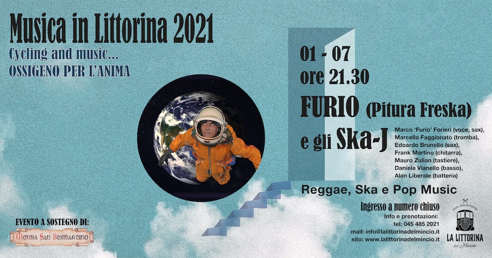 Giovedì 1 luglio 21,30 “Musica in Littorina 2021”, propone FURIO E GLI SKA-J (Reggae-SKA-Pop Music). Marco Furio Forieri grande cantante, autore, compositore ed editore, è stato uno dei principali protagonisti del gruppo musicale Pitura Freska.