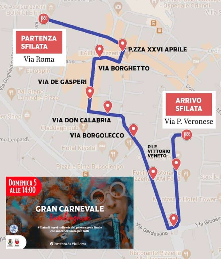 Saranno ben 19 i carri che daranno vita alla sfilata, tra i più belli e importanti della provincia di Verona, con arrivi anche dalle province di Mantova e Brescia. L’allegro corteo quest’anno avrà un percorso diverso dalle precedenti edizioni. La sfilata partirà alle 14:00 da via Roma e passerà in Piazza XXVI Aprile, in via Borghetto, via De Gasperi. Si proseguirà poi in via Don Calabria, via Borgolecco e intorno a Piazzale Vittorio Veneto per terminare in via Paolo Veronese con la premiazione seguita dalla gran “Maccheronata”, nel pieno spirito di festa e convivialità tipico del carnevale. Non mancheranno le maschere ufficiali più note e il Papà del Gnoco, sire del Carnevale veronese. La sfilata sarà inoltre accompagnata dalle note del Corpo Bandistico Città di Bussolengo e dal gruppo Majorettes Afrodite.