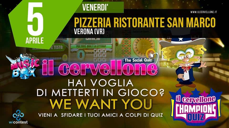Il Cervellone Quiz Game, il più giocato d’Italia arriva alla Pizzeria San Marco a Verona, tante manche con domande giochi e divertimento assicurato! Prenota il tuo tavolo cena, crea la tua squadra e vinci!