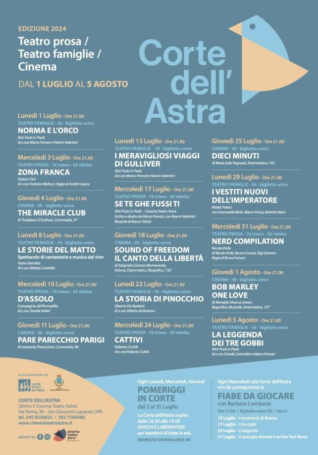 In totale, cinque proiezioni cinematografiche, cinque appuntamenti col teatro di prosa e sei col teatro famiglie, più quattro fiabe da giocare. Da segnalare lo spettacolo “Tipi”, in programma mercoledì 24 luglio, di e con Roberto Ciufoli: un’autentica cavalcata attraverso gli aspetti più nascosti ed esilaranti dell’animo umano, tra monologhi, canzoni e balli. Poi, il ritorno dell’acclamato “Se te ghe fussi ti”, l’imprevedibile “A Nerd Compilation”, la biopic “Bob Marley – One Love” che chiude la rassegna. L’iniziativa “Fiabe da Giocare” si articola in quattro appuntamenti che si svolgeranno ogni mercoledì alle ore 17.00, con spettacoli teatrali interattivi in cui la protagonista Barbara Lombana coinvolge e gioca con i piccoli spettatori.