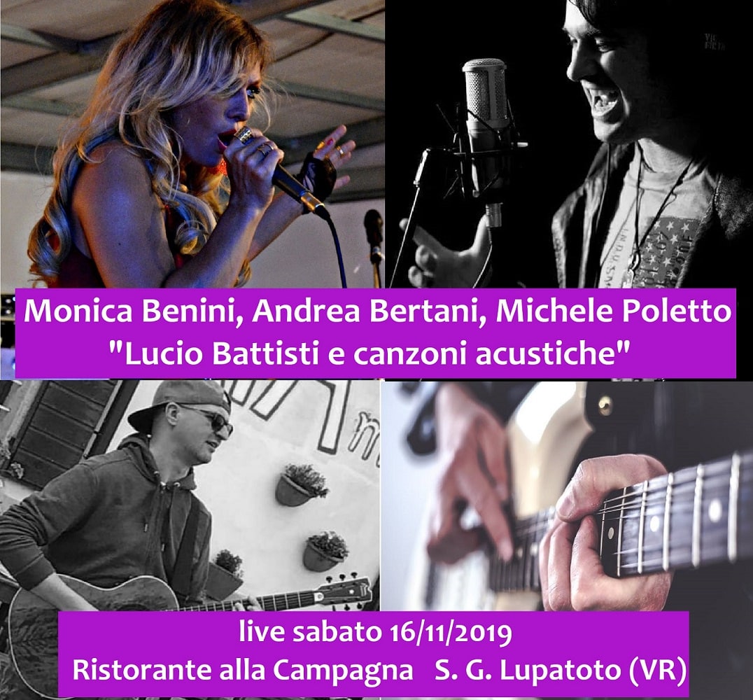 Il trio in acustico composto da Monica Benini, Andrea Bertani e Michele Poletto vi faranno rivivere l’atmosfera delle canzoni italiane d’autore e proporranno canzoni inedite con un pizzico di repertorio internazionale.