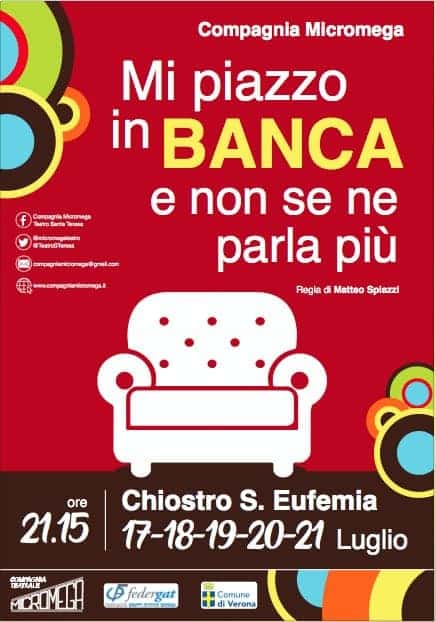 La Compagnia Teatrale Micromega presenta in anteprima assoluta “Mi piazzo in banca e non se ne parla più” testo e regia di Matteo Spiazzi tutte le sere dal 17 al 21 Luglio alle ore 21.15 presso il Chiostro Di Sant’Eufemia.