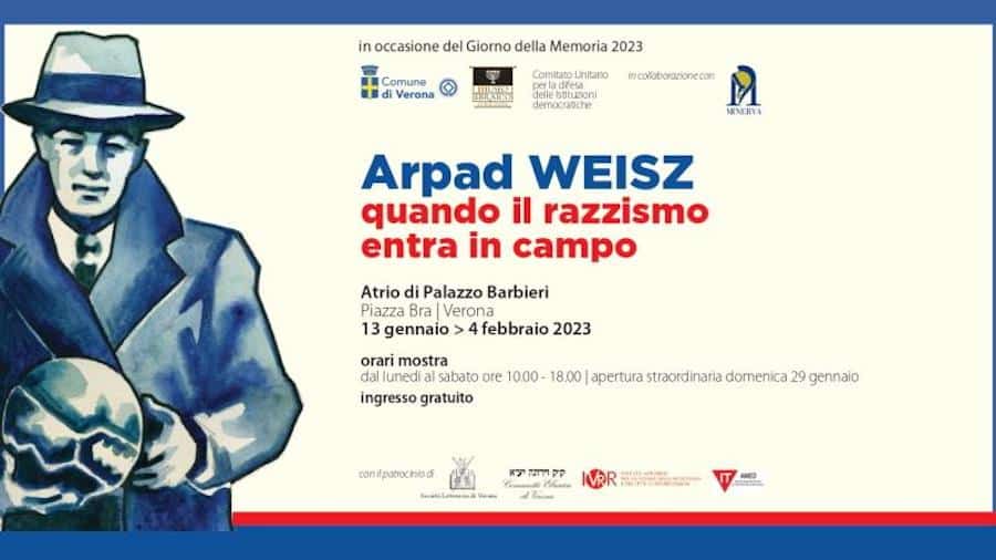In occasione del Giorno della Memoria, il Comune di Verona e il Museo Ebraico di Bologna in collaborazione con Edizioni Minerva, presentano, dal 13 gennaio 2023 nell’atrio di Palazzo Barbieri, una mostra su Arpad Weisz (Solt, Ungheria, 1896 – Auschwitz, Polonia, 1944), l’allenatore ebreo ungherese che dal 1935 al 1938 portò la squadra di calcio del Bologna a vincere per due volte consecutive lo scudetto e la prestigiosa Coppa del Torneo dell’Esposizione di Parigi nel 1937.
