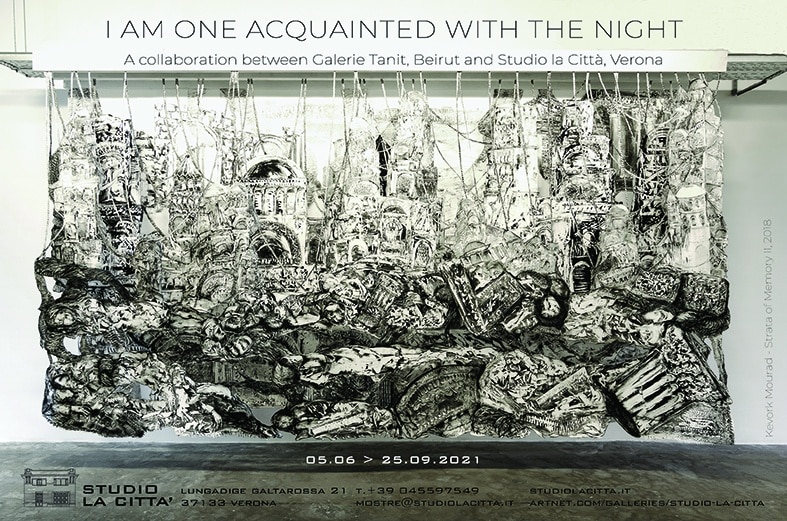 “I am one acquainted with the night” è una collaborazione tra Studio la Città e Galerie Tanit, Beirut che intende riflettere sul tema della solidarietà e della resilienza. Il titolo è preso in prestito da una poesia di Robert Frost: dichiara la familiarità con il buio per permettere alla luce di tornare attraverso il lavoro di 15 artisti.