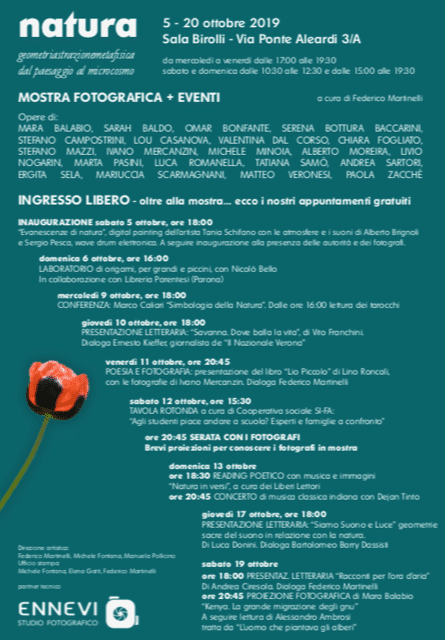 Ma la mostra è anche evento multi disciplinare e multi artistico dal momento che la mostra sarà arricchita da una serie di appuntamenti tra cui incontri, dibattiti, proiezioni fotografiche, conferenze e letture a tema. Partner dell’evento sono Studio Fotografico Ennevi (per la stampa delle fotografie) e Sartori Vini. È Martinelli a specificare: “Uomo e Natura, binomio inscindibile. Un connubio con il nostro quotidiano: essa reagisce e risponde ai nostri solleciti come noi ci adattiamo alle sue variazioni, alla sua energia, a ciò che ci offre. Per questo ogni incontro rappresenta l’occasione per vedere la mostra sotto punti di vista differenti.La mostra è aperta tutti i giorni da mercoledì a venerdì dalle 17:00 alle 19:30. Sabato e domenica dalle 10:00 alle 19:30 a eccezione delle giornate nelle quali l’orario sarà prolungato per la concomitanza con gli eventi complementari all’esposizione.