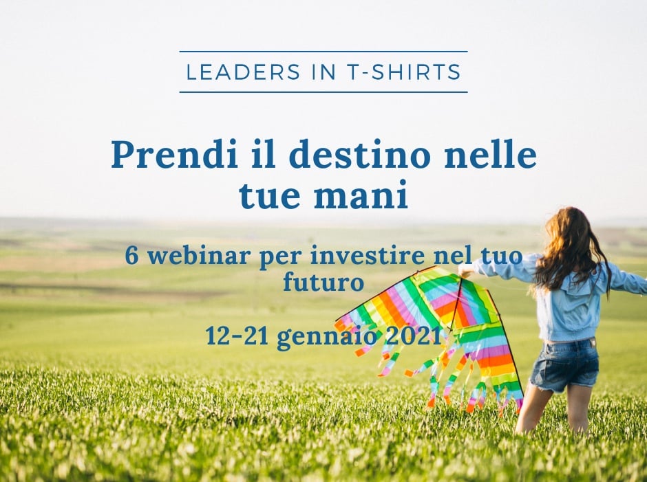 La partecipazione ai successivi webinar è soggetta al versamento della quota di iscrizione pari a 90 euro. Per partecipare, aderisci qui: https://leadersintshirts.com/prendi-il-destino-nelle-tue-mani-offerta/