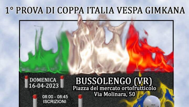 Domenica 16 aprile presso il Piazzale del Mercato Ortofrutticolo di Bussolengo (VR) via Molinara 50 con il patrocinio del Comune di Bussolengo: 1^ Prova della Coppa Italia di Vespa Gimkana.
