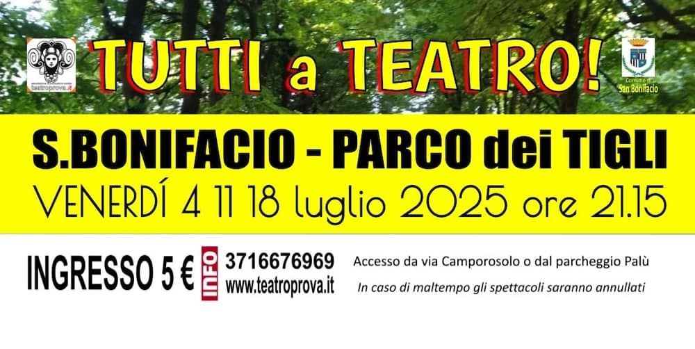 Dal 4 luglio il Parco dei Tigli di San Bonifacio ospiterà la rassegna estiva “Tutti a teatro!” promossa dall’associazione Teatro Prova con il patrocinio del Comune di San Bonifacio. In programma quattro spettacoli domenicali.