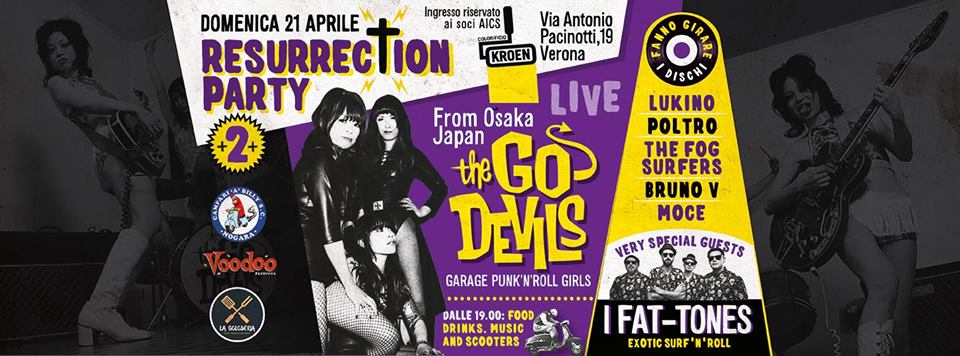 Dopo le danze sfrenate della prima edizione, torna il Resurrection Party che per il suo secondo atto cala l’asso con il concerto delle The Go-Devils, mitico power trio garage-punk’roll femminile giapponese e I Fat Tones con il loro surf’n’roll dal gusto exotico. Se non bastasse ben 5 DJ in consolle a fare girare i dischi, dal rock’n’roll al northern soul, dall’aperitivo a mattina; e inoltre cibo, drinks, birrette, Vespe e Lambrette in quantità per fare una festa rumorosa, grossa ed eclatante come una resurrezione!
