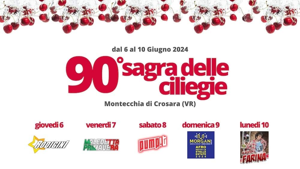 Dal 5 al 9 Giugno 2025 la Pro Loco di Montecchia di Crosara presenta la novantunesima edizione della Sagra delle Ciliegie.