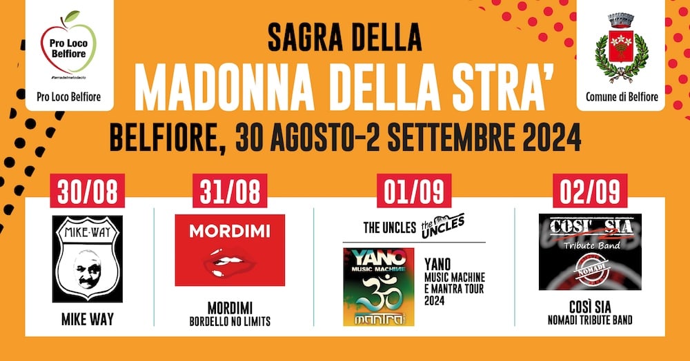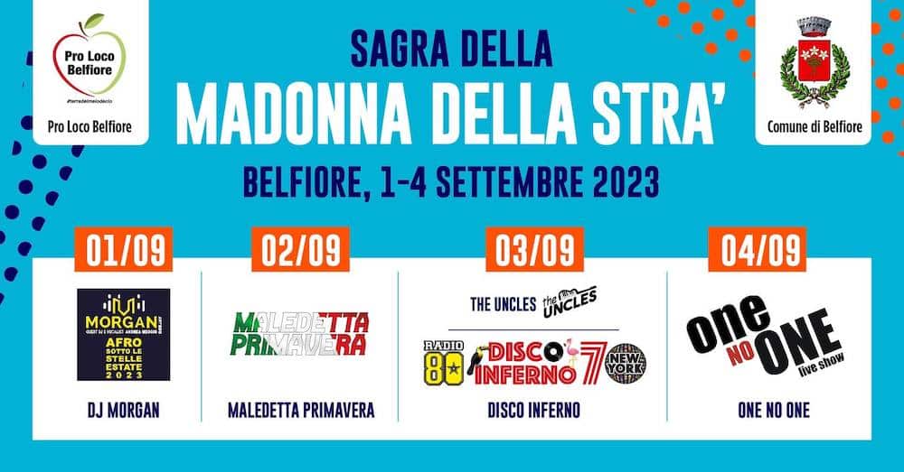 Da venerdì 30 Agosto a lunedì 2 settembre 2024 si tiene la Sagra della Madonna della Stra’ a Belfiore organizzata dalla Pro Loco e con il patrocinio del Comune di Belfiore.