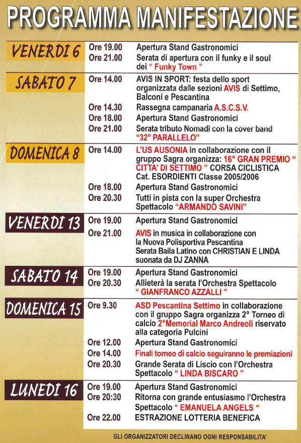 La tradizionale sagra sarà organizzata dalla parrocchia di Settimo con il patrocinio del Comune di Pescantina. L’evento si terrà durante i giorni 6 – 7 – 8 / 13 – 14 – 15 – 16 Settembre 2019.
