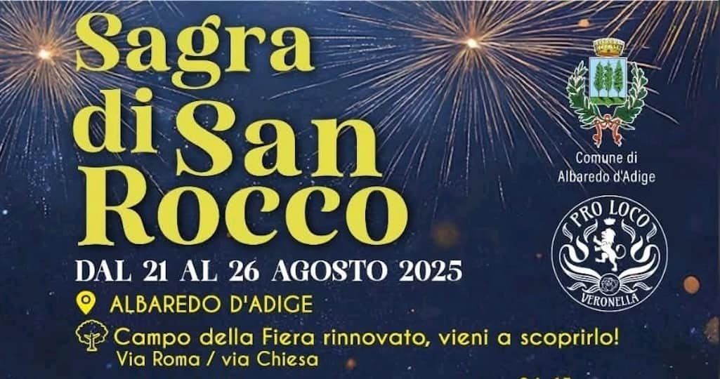 Da Giovedì 21 a martedì 26 agosto torna la tradizionale sagra di San Rocco ad Albaredo d’Adige, uno degli appuntamenti estivi più seguiti nell’Est Veronese, in particolare per l’attrazione dei grandiosi fuochi pirotecnici finali sulle rive dell Adige. Lo spettacolo sarà preannunciato da fiaccole galleggianti che correranno lente sullo spazio acqueo predisposto allo spettacolo.