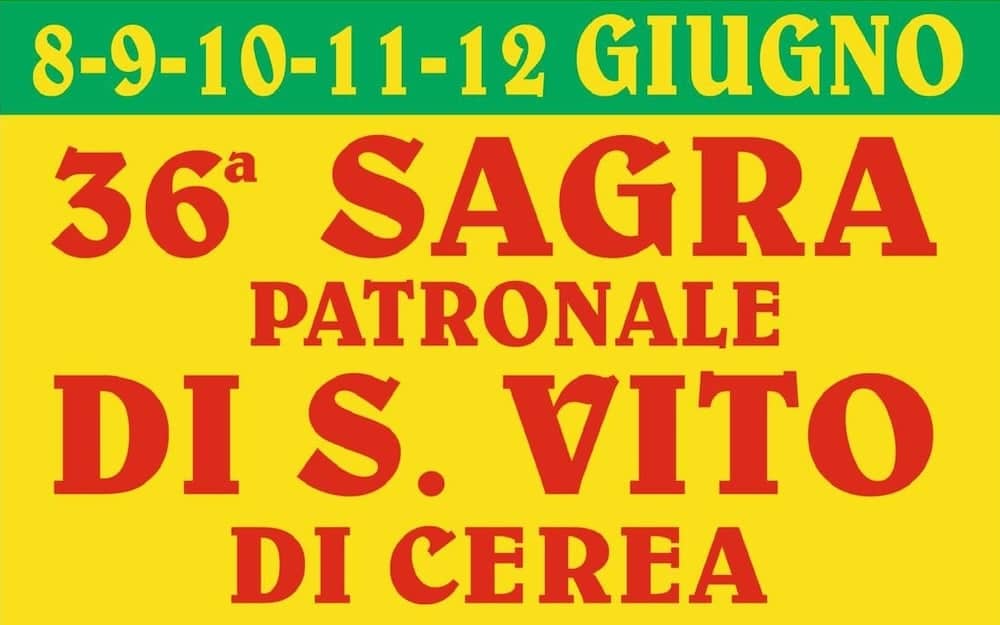 Da sabato 7 a martedì 10 giugno il comitato di quartiere San Vito di Cerea e la parrocchia di San Vito Martire organizzano la 37esima edizione della Sagra Patronale di San Vito. Durante la sagra saranno presenti il luna park, la musica, i balli e gli stand gastronomici. Grande pesca di beneficienza. Mostra di Foto d’epoca a cura dei F.lli Merlin e Mostra di pittura a cura di Appio Spagnolo.