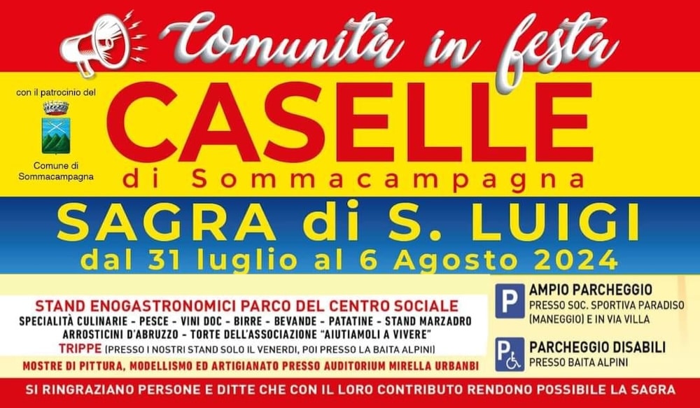 Dal 31 Luglio al 6 Agosto 2024 è in programma la Sagra di San Luigi a Caselle di Sommacampagna con stand enogastronomici al parco del Centro Sociale con specialità di pesce, carne, arrosticini e trippe. Troverete inoltre mostre di pittura, modellismo ed artigianato presso l’auditorium Mirella Urbanbi.