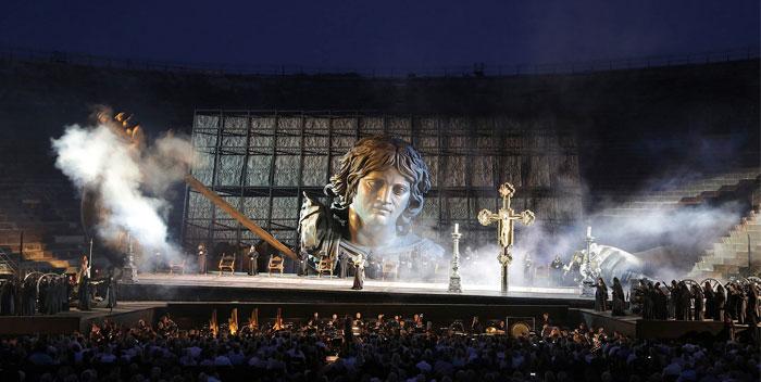 Hugo de Ana porta Tosca negli ampi spazi areniani con una messa in scena ideata ad hoc nel 2006, che ogni volta riscuote grande plauso e ammirazione dal pubblico del Festival lirico. Per mettere in scena «un’opera di personaggi», come l’ha definita lo stesso regista, De Ana ha puntato su una teatralità di tipo cinematografico, che sapesse trasmettere la psicologia dei personaggi e cogliere in maniera profonda le loro intenzioni drammatiche.