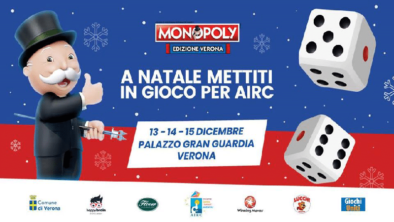 Venerdì 13, sabato 14 e domenica 15 dicembre si svolge “A Natale mettiamoci in gioco per l’AIRC” al Palazzo della Gran Guardia. L’evento è organizzato da Monopoly – Edizione Verona con AIRC e il patrocinio del Comune di Verona