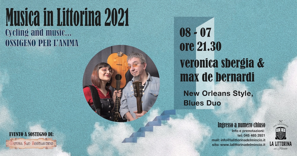 Giovedì 8 luglio 21,30 Musica in Littorina 2021, propone VERONICA SBERGIA E MAX DE BERNARDI (New Orleans Blues Duo). Veronica Sbergia cantante e Max De Bernardi grande conoscitore del genere country blues, si propongono in duo in un blues delle origini. Insieme, nel 2009, danno vita al progetto Veronica & The Red Wine Serenaders, ensemble acclamato dalla stampa specializzata nazionale come “la più bella realtà europea in fatto di country-blues, ragtime, hokum e jugband music” (Il Buscadero), e si aggiudicano il 1° posto all’European Blues Challenge.