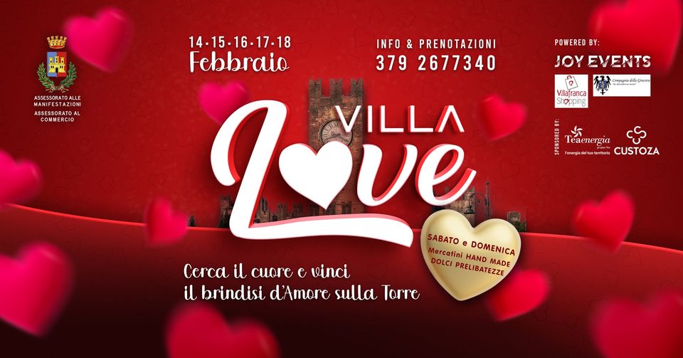 Il Comune di Villafranca di Verona si tinge d’amore per festeggiare con tutti gli innamorati la rinomata festa di San Valentino con l’evento “Villalove” in programma dal 14 al 18 Febbraio 2024.
