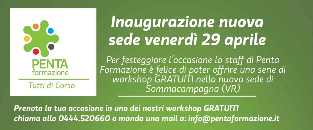 Dopo cinque anni di attività a Vicenza, Penta Formazione torna finalmente a Verona e più precisamente il 29 aprile a Villa Venier, villa settecentesca a Sommacampagna, ci sarà l’inaugurazione della nuova sede. La Villa, recentemente ristrutturata dal Comune di Sommacampagna, può ora disporre di 3 nuove aula formazione e 8 postazione di coworking(nel pacchetto sono inclusi quindi aiuti professionali di chi opera all’interno di Pentaformazione oltre che di altri professionisti e/o colleghi).
