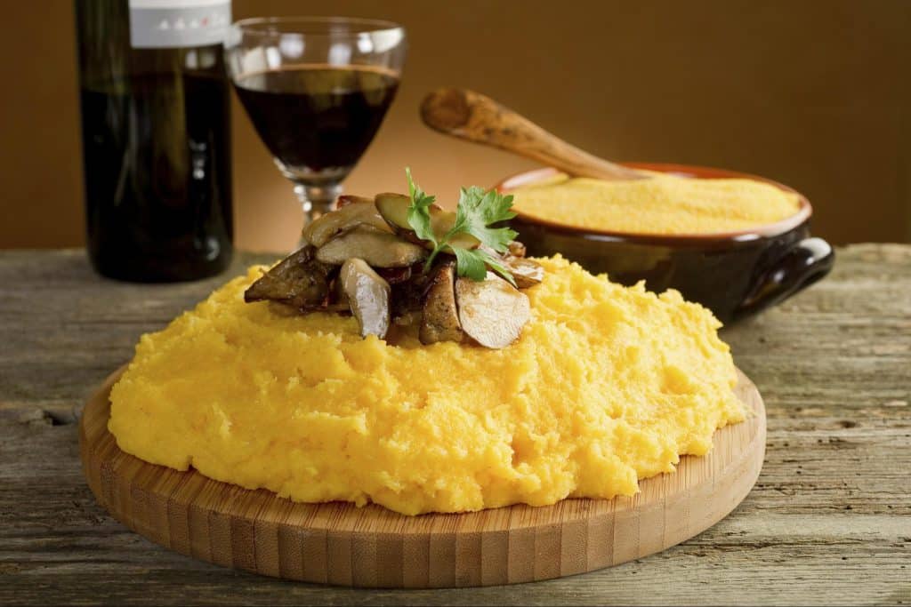 Ingredienti per 4 persone: 550 g di farina gialla, 200 g di passata di pomodoro, 1 cipolla, 1 carota, 1 costa di sedano, 200 g di polpa di manzo, 200 g di rigaglie di pollo, vino bianco, 20 g di funghi secchi, 100 g di prosciutto crudo, 90 g di grana grattugiato, olio extra vergine, un po’ di burro, sale pepe.